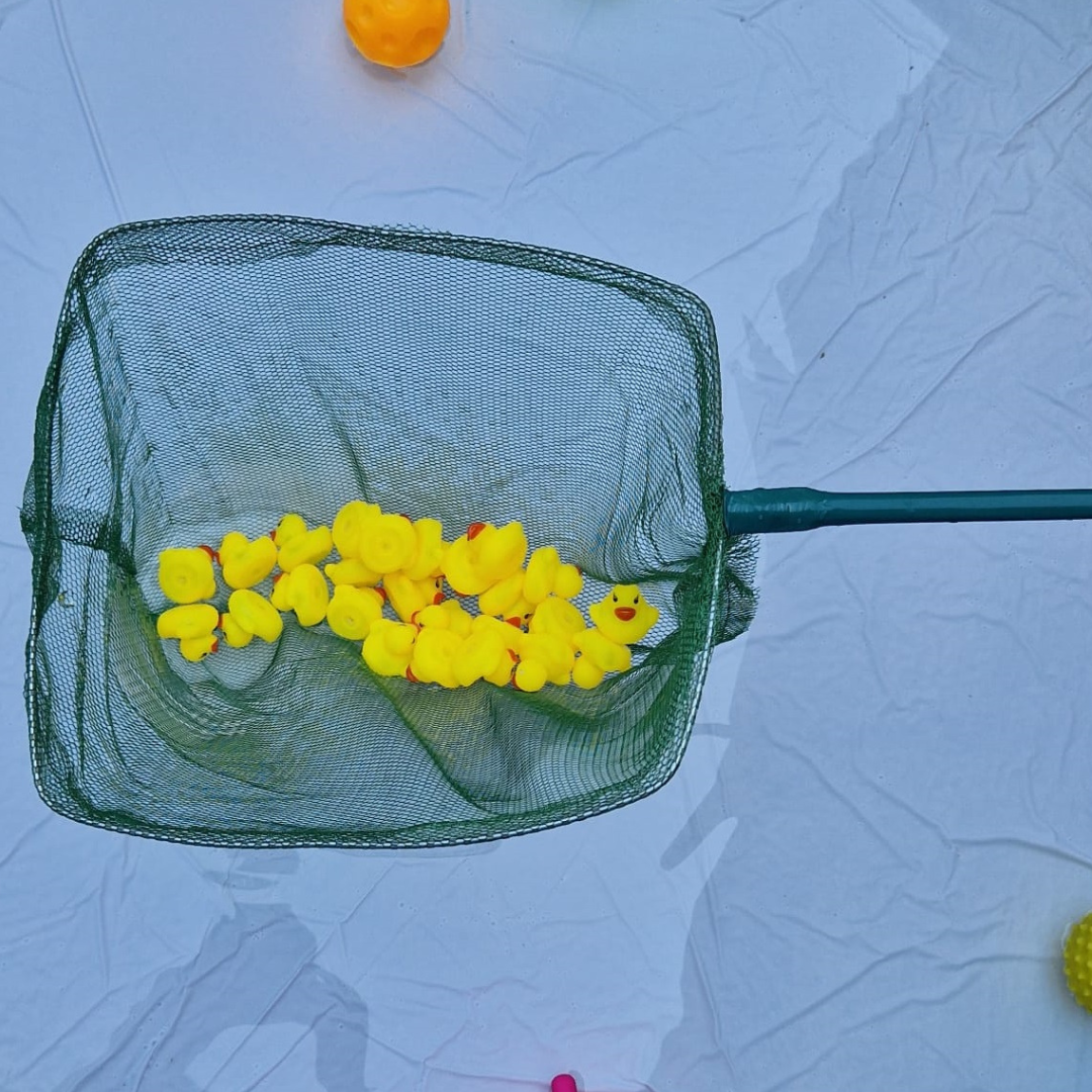 Amb l’ajuda de piscines inflables simulem basses des d’on pescar. Després, oferim salabrets per tal que qui vulgui jugar pugui pescar els ànecs i les peces flotants que més bé vagin.