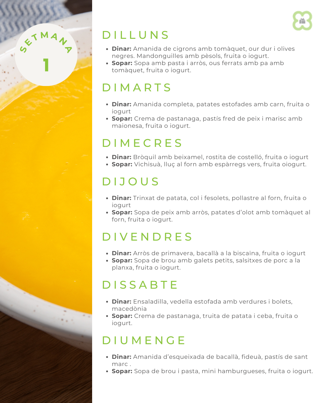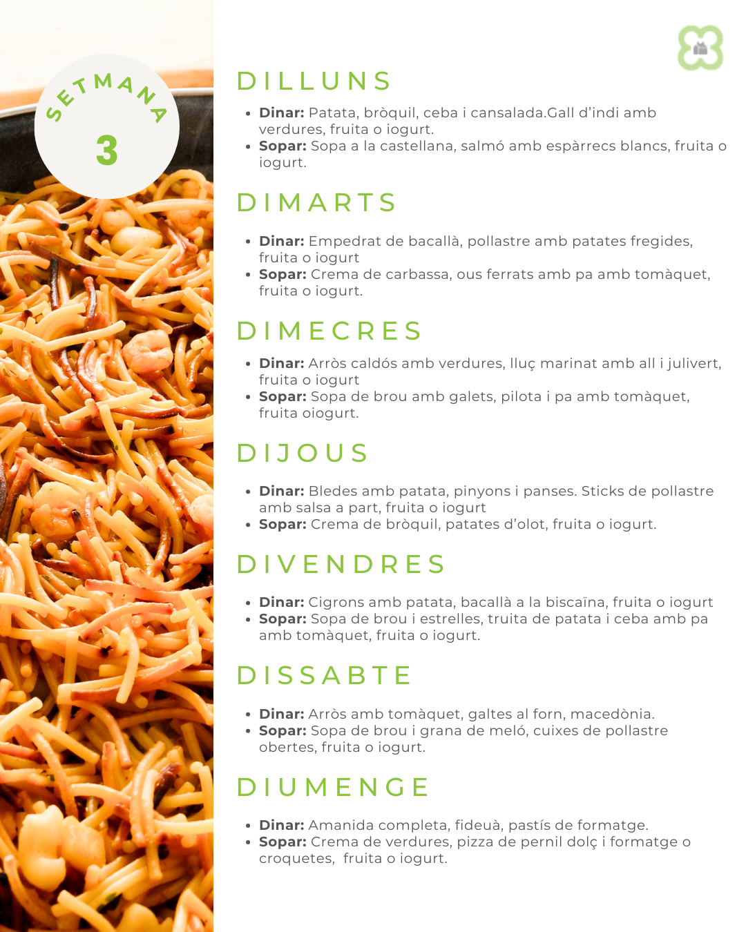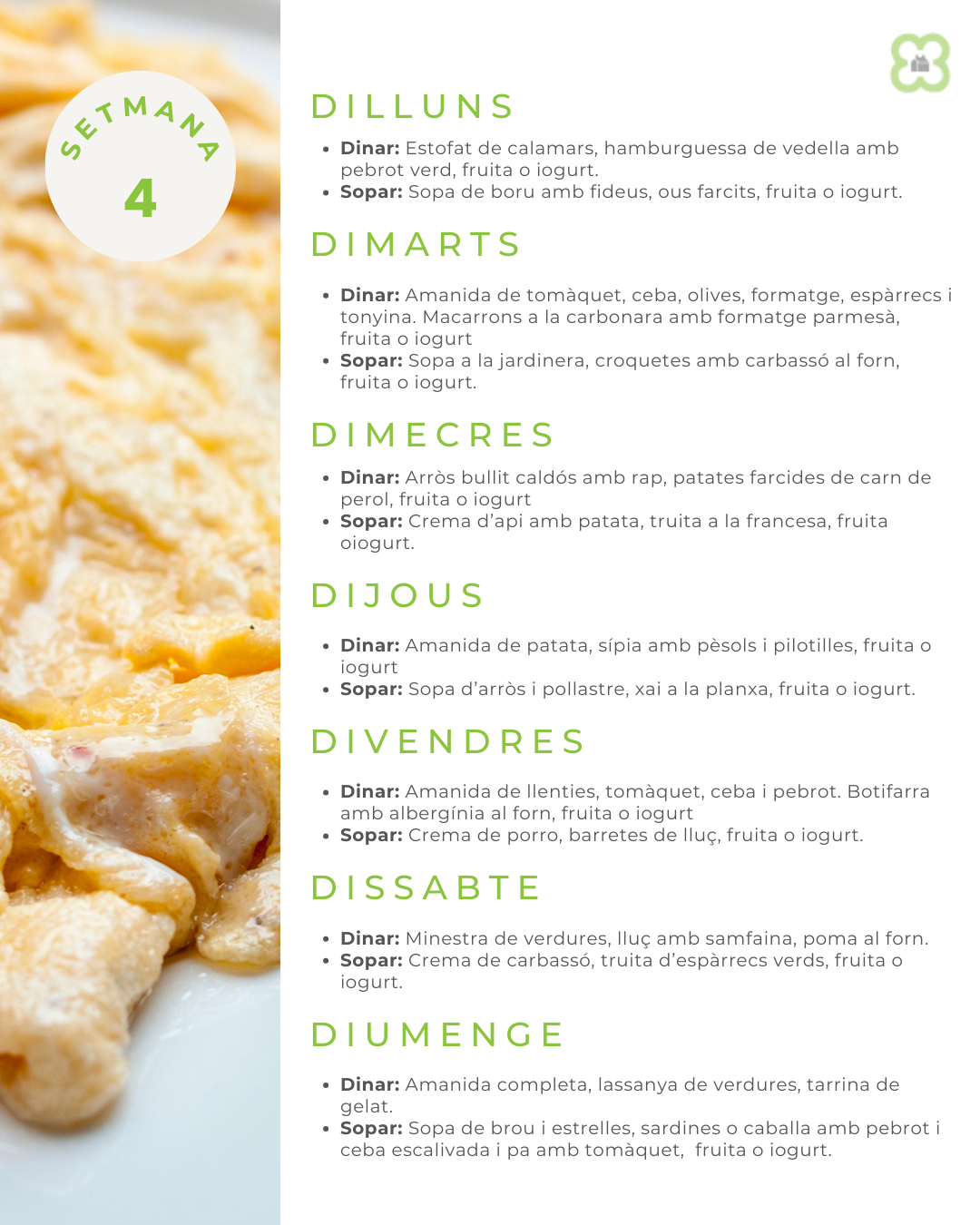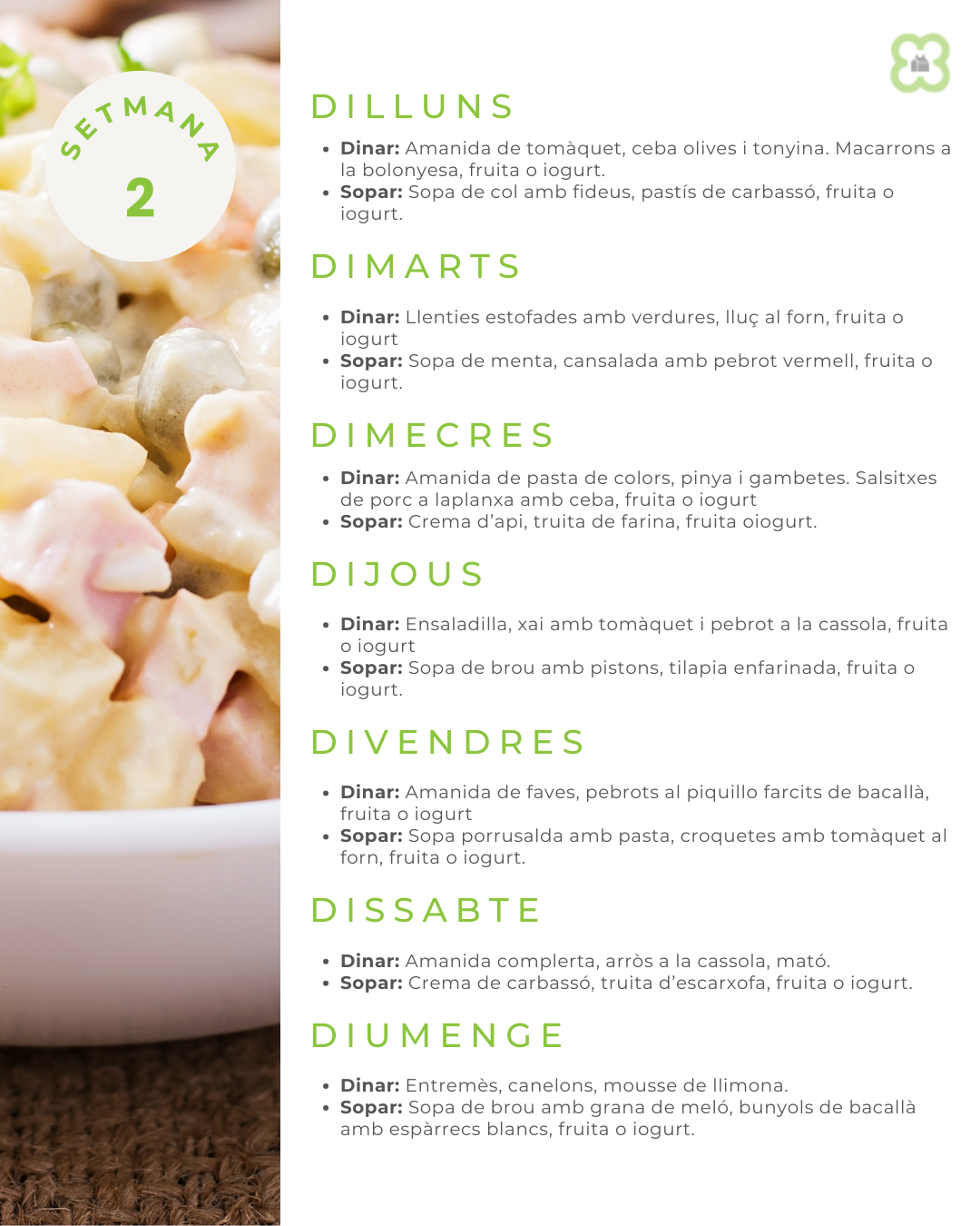 Aquesta és la relació de menús setmanals que servirem durant aquesta temporada de primavera i estiu.