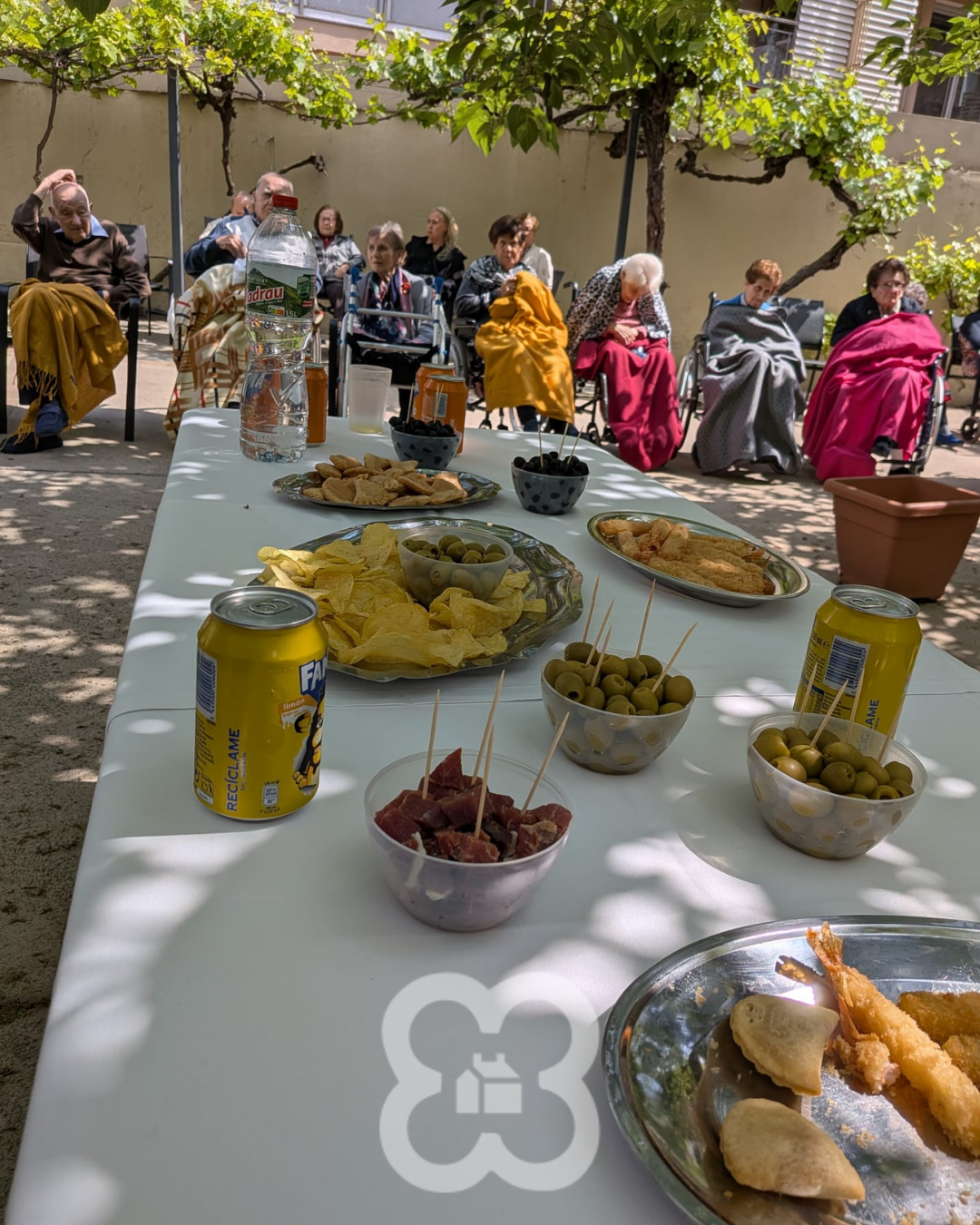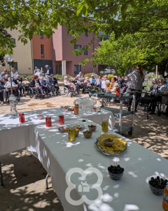 De tornada, la celebració va continuar a la residència amb un aperitiu ben especial, al jardí, amb música en directe, que va posar ritme i alegria a la celebració. Van sonar cançons conegudes, que encara feien que el dia fos més bonic i emotiu; i com ja us podeu imaginar, les vam cantar i ballar. Més tard, es va servir un aperitiu a l’aire lliure aprofitant el bon temps i la tranquil·litat d’un entorn privilegiat.